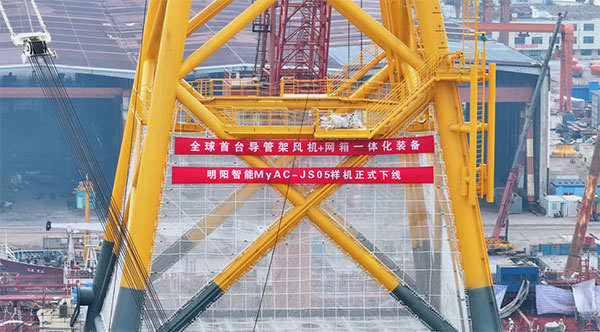 “導(dǎo)管架風(fēng)機+網(wǎng)箱”風(fēng)漁融合一體化裝備MyAC-JS05正式下線。受訪者供圖