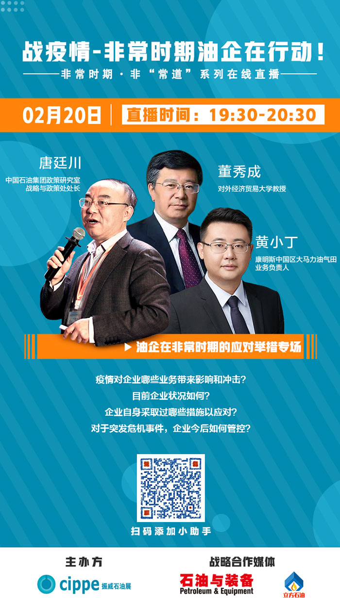 2月20日,由cippe北京石油展組委會(huì)主辦,《石p油與裝備》、《立方石油》兩大媒體戰(zhàn)略支持的“非常時(shí)期·非常道系列在線直播會(huì)議”活動(dòng)將正式啟動(dòng)。屆時(shí),將邀請專家、學(xué)者、企業(yè)負(fù)責(zé)人就當(dāng)前疫情下油氣行業(yè)面臨的問題、困難及挑戰(zhàn),以在線直播形式展開研討,共同探討并尋求解決路徑,為行業(yè)企業(yè)發(fā)展建言獻(xiàn)策。
