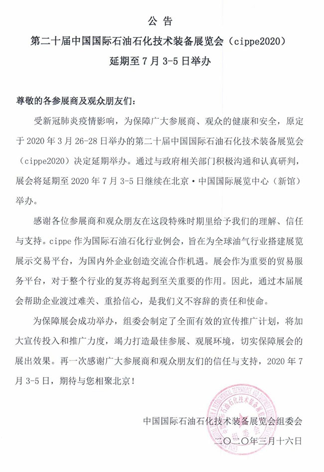 受新冠肺炎疫情影響,原定于2020年3月26-28日舉辦的第二十屆中國(guó)國(guó)際石油石化技術(shù)裝備展覽會(huì)(cippe2020),將延期至7月3日至5日在北京·中國(guó)國(guó)際展覽中心(新館)舉行,歡迎您屆時(shí)參展參觀。