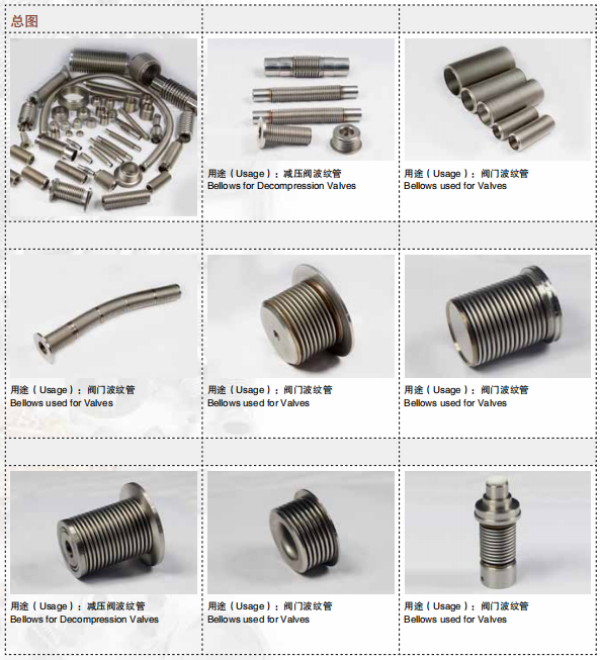 本公司生產(chǎn)各類與波紋管相關(guān)的組件,和黃銅及鎳銅合金波紋管。產(chǎn)品應(yīng)用于機(jī)械、石化、電力、紡織、冶金、船舶、航天等領(lǐng)域。